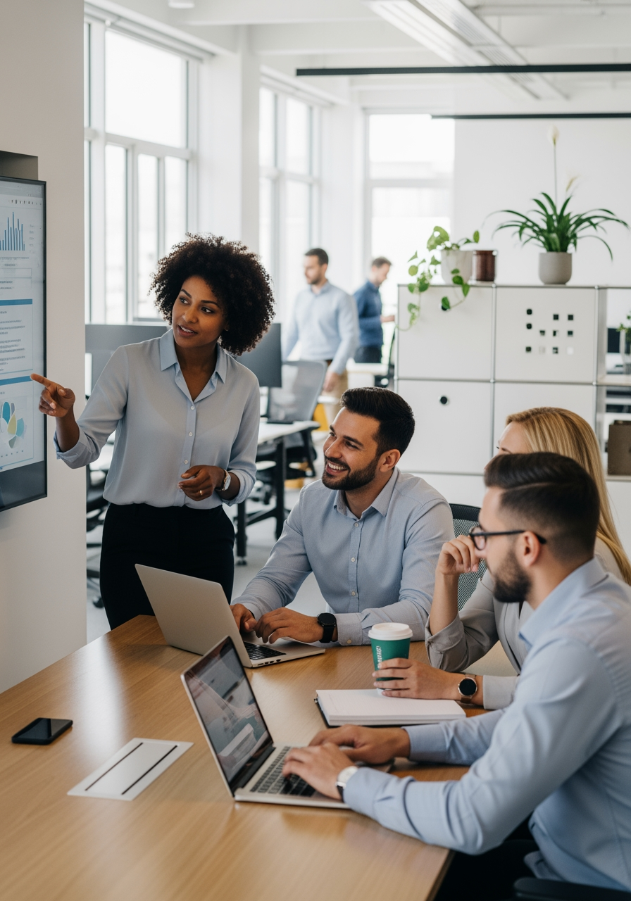 Office and team frames with believable depth—useful for HR, annual reports, and About pages before you commission a shoot.