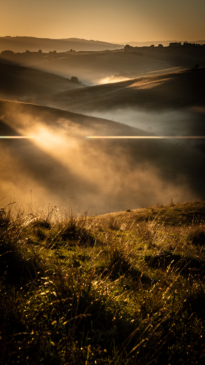 Vârfuri în ceață și cer stratificat, ca pentru one-sheet — util când deck-ul cere scară fără clișee de stock.